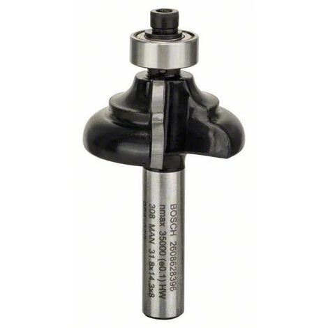 Profilfräser C mit Anlaufkugellager, zweischneidig, Hartmetall, Schaft: 8 mm, Radius: 4,8 mm, Breite: 9,5 mm, Arbeitslänge: 14 mm, Gesamtlänge: 57 mm, zum Herstellen von Werkstückkanten an Korpussen, Fachböden, Rahmen sowie zur Gestaltung von Kranz- und Rahmenprofilen, mit Anlaufkugellager für einfaches Führen am Werkstück, Bosch-Profilfräser für perfekte Möbeltischlerarbeiten