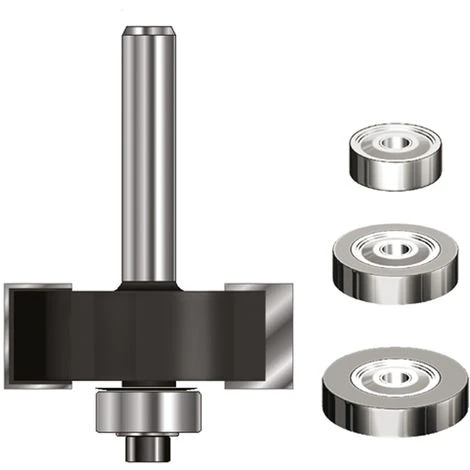 Set bestehend aus Falzfräser und vier Kugellagern mit verschiedenen Durchmessern, so dass Fälze mit verschiedenen Tiefen möglich sind.