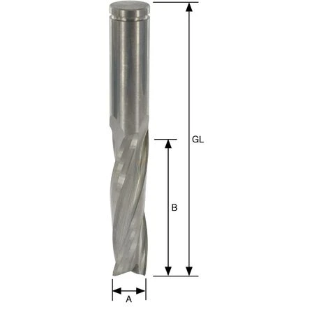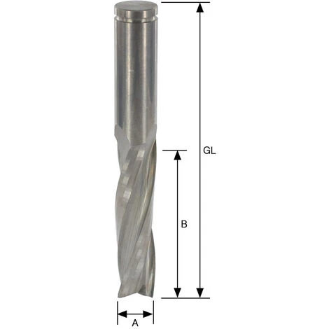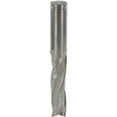 Schlichtfräser mit zwei spiralgenuteten Vollhartmetall-Schneiden, grund- und umfangschneidend, durchgehend zylindrisch. Rechtslauf/Rechtsdrall. Mechanischer Vorschub. Bei guter Werkstückspannung liegt die Gutseite des Werkstücks unten. Optimale Spanabfuhr nach oben.
