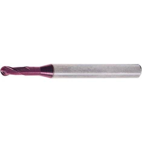 VHM-Mini-Radiusfr�ser Ausf�hrung: Mit Zentrumschnitt, zum Bohren geeignet. Anwendung: Durch verj�ngten Hals besonders in tief liegenden Bereichen zum Kopier- und Nutenfr�sen geeignet. F�r die HSC-Bearbeitung bis 52 HRC geeignet.
