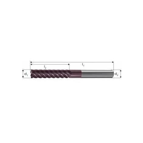 VHM-Schaftfräser, lang, Schaft HB, TiAIN-beschichtet•VHM UF•Typ H•Werksnorm•Zum Umfangsfräsen, Besäumen, Feinstschlichten•HSC-Bearbeitung bis 62 HRC•Trockenbearbeitung möglich | Eigenschaften: Ø d1 e8: 10,0 mm, Gesamtlänge l1: 100 mm, Arbeitslänge: 40 mm, Schaft-Ø d2 h6: 10 mm, Zähnezahl: 6, Stahl <850 N: 170, Stahl <1000 N: 170, Stahl <52 HRC: 55, Ti, Ti-Leg. und Sonderstähle: 105, Gusseisen: 200, Alu, NE-Metalle, NE-Leg.: 900, Kupfer, Messing, Bronze: 220, Emulsion: empfohlen, Öl: empfohlen, Luft: bedingt geeignet, ohne Kühlung: geeignet, Gesamtlänge: 100 mm