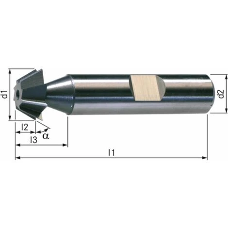 Winkelfräser HSSE Co 5 • Anwendung: Zum Fräsen von Führungen und anderer Winkelgeometrien im Werkzeug- und Maschinenbau. • Ausführung: geradegenutetfeinverzahntZylinderschaft nach DIN 1835 B.am Umfang schneidend