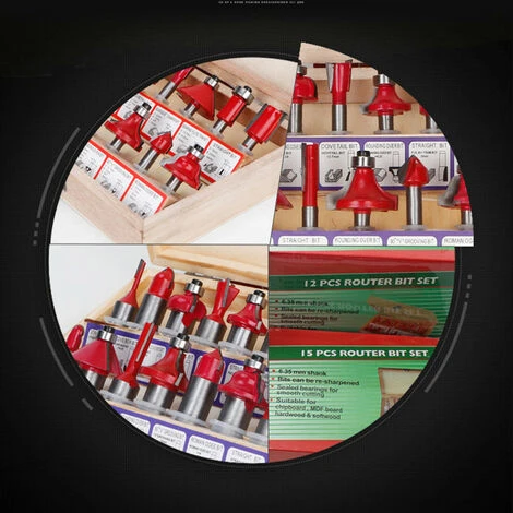 Beinhaltet: Gerade: 6 x 20 mm, 12 x 20 mm, 16 x 20 mm; 90° Nuten: 12,7 mm; 45° Schwalbenschwanz: 12,7 mm; 45°-Fase: 32 mm; Lagerbündiger Abschluss: 12,7 x 13 mm; Rundung: R6,3 D22,2 mm, R9,5 D28,6 mm; Voutenkasten: R6.3 D12.7mm; Bucht: R6,3 D22,2 mm; Römischer Spitzkegel: R4 D25,5 mm